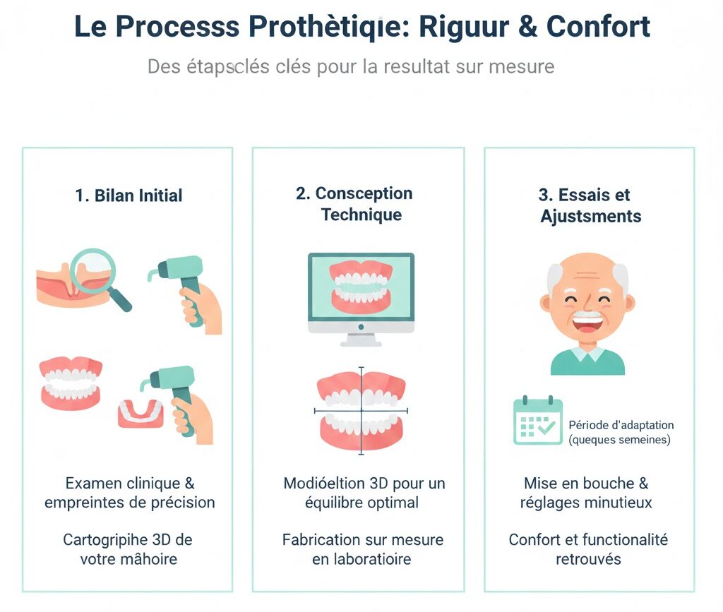 Obtenir une prothèse stable et confortable demande de la rigueur et plusieurs étapes: